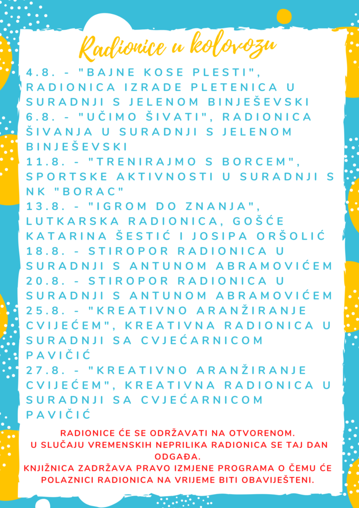 Dragi polaznici radionica, “Ljeto u knjižnici” nastavlja se i u kolovozu.Radionice će se održavati prema istom rasporedu, utorkom i četvrtkom od 17,00 do 18,30 sati. Očekuje Vas puno raznovrsnih i zanimljivih radionica. S nestrpljenjem očekujemo zajednička druženja!