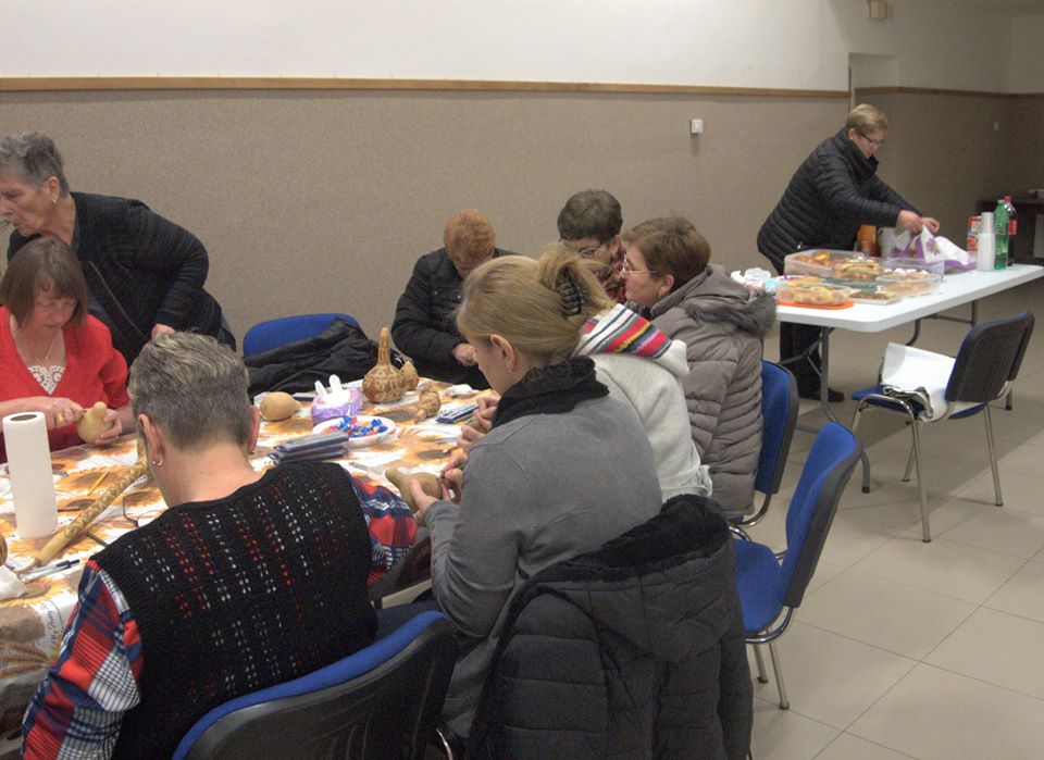 Kako uvijek biva, u dobrome društvu vrijeme brže leti. Tako smo i mi malo „probili“ dogovorenu satnicu pa su nas polaznici u Račinovcima morali pričekati. Budući da su već neko vrijeme željno iščekivali ovu radionicu, domaćini su nas širokogrudno dočekali u Domu kulture te nas počastili svojim poslasticama. Veći odaziv polaznika je prema tome rezultirao i mnoštvom različitih drugih motiva na tikvicama. Ovim putem još jednom se zahvaljujemo svim šaračima i udruzi „Cvelferke“ iz Račinovaca koja nas je lijepo ugostila!