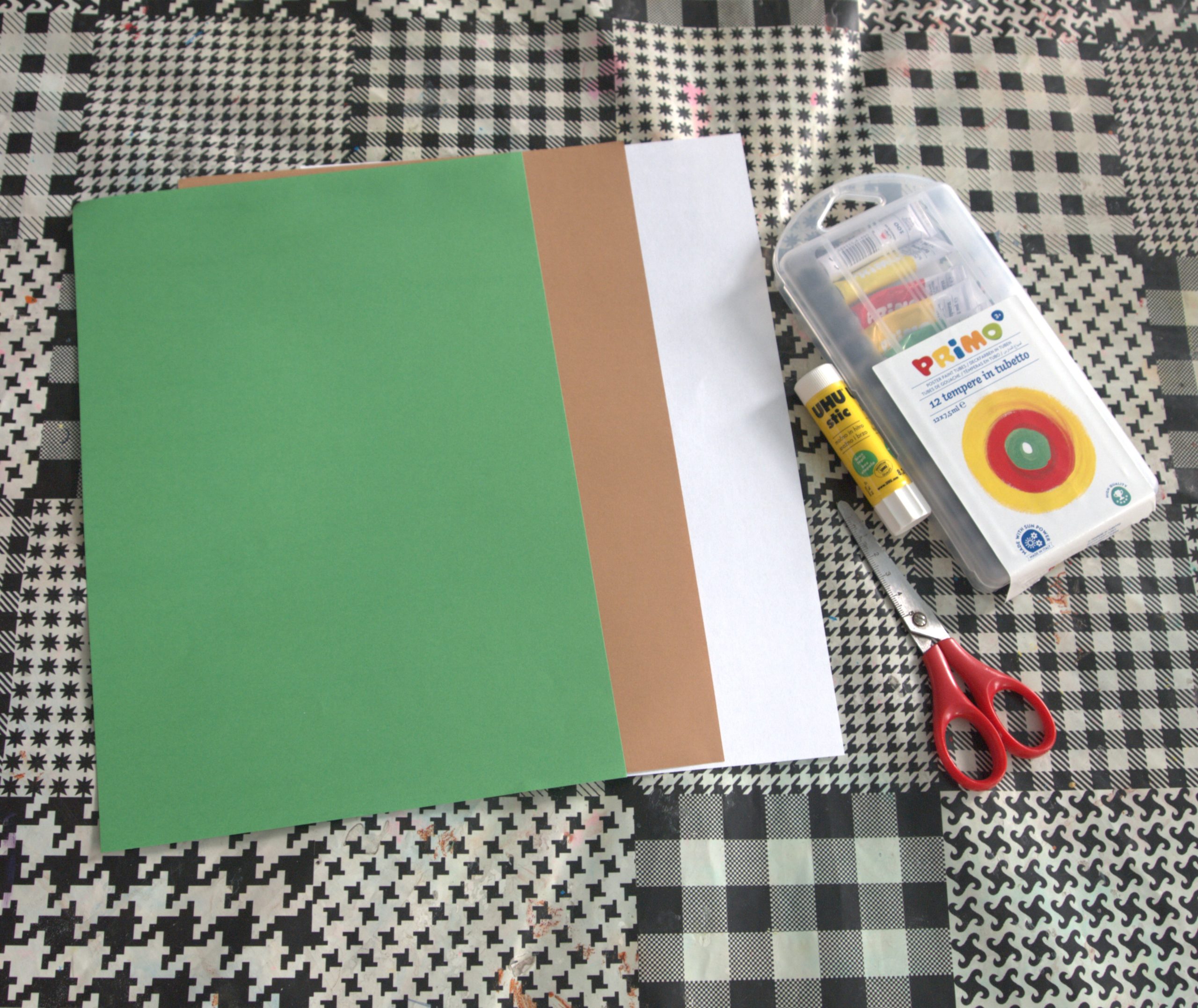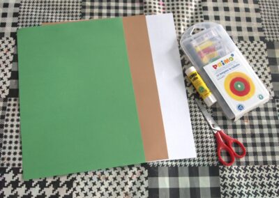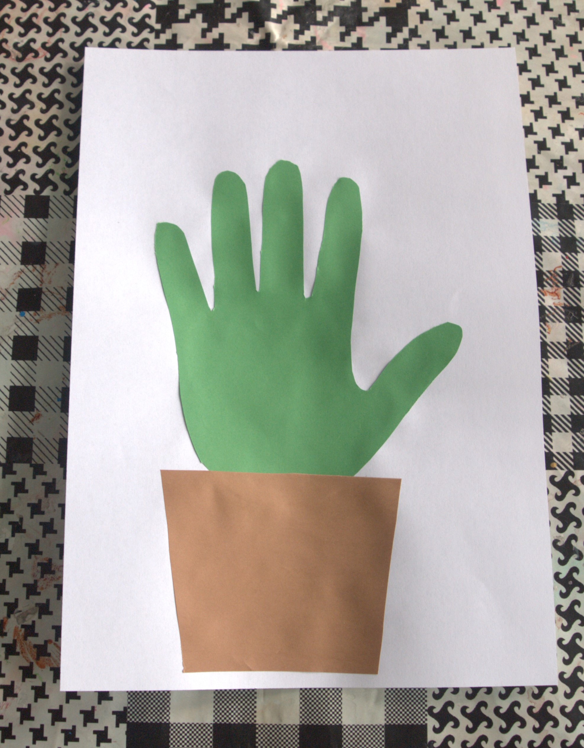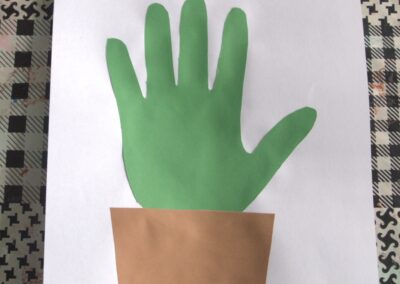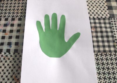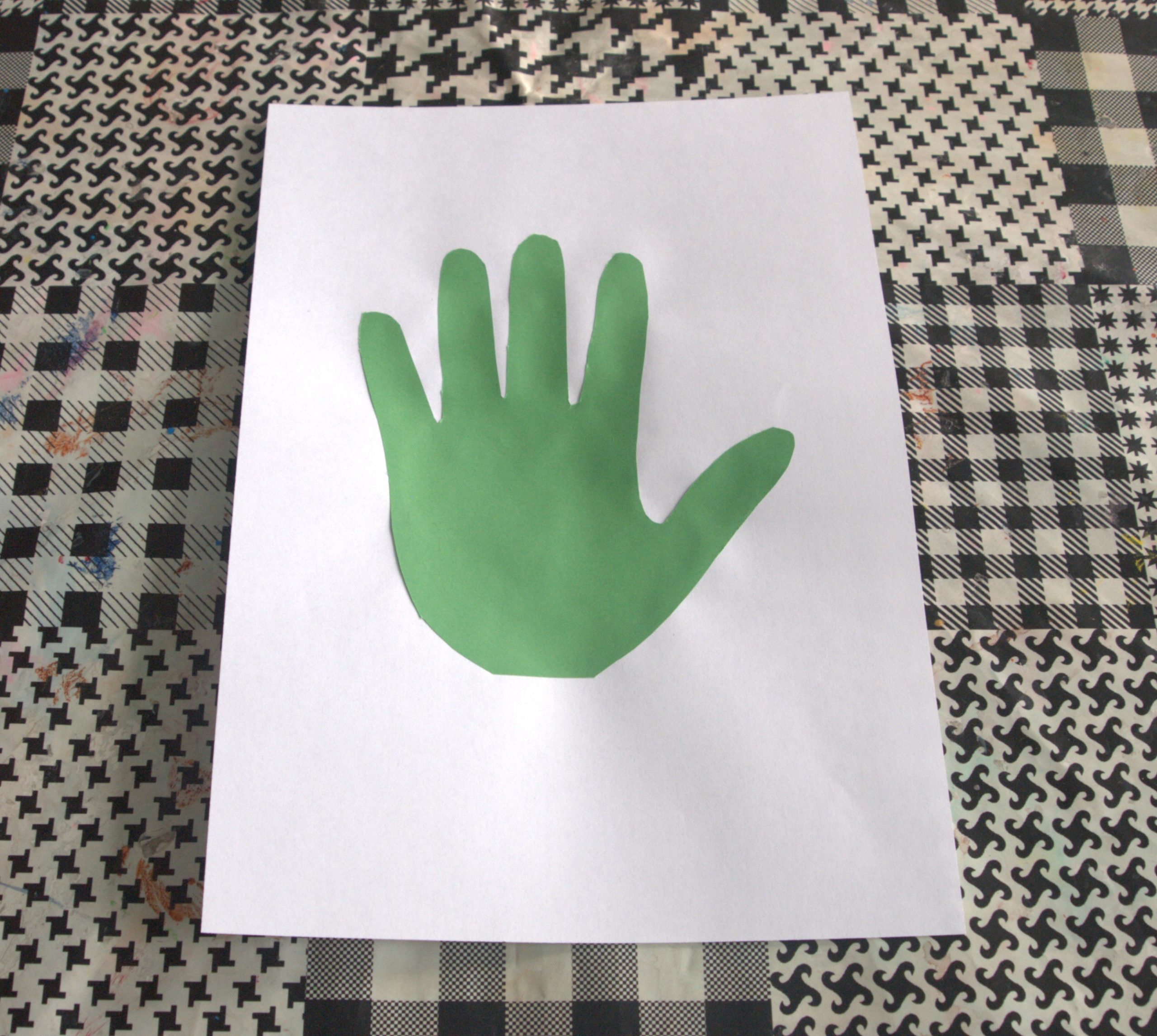 1. korak : na zelenom listu kolaž papira ocrtati dlan djetata i izrezati. Zalijepiti na bijeli papir.