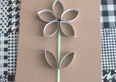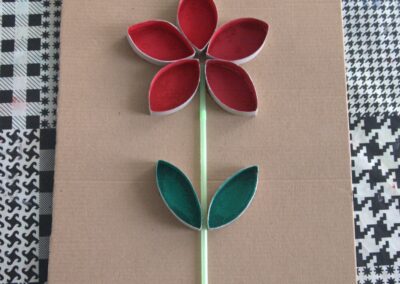 3. korak : od preostalih traka zalijepimo oblik latica cvijeta. Obojamo latice i listove cvijeta.