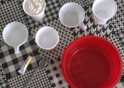 2. korak : Smjesi dodajte 2 žličice ulja i jednu čašu tople vode. Dodajte temperu željene boje u smjesu i malo razmiješajte sa žličicom.