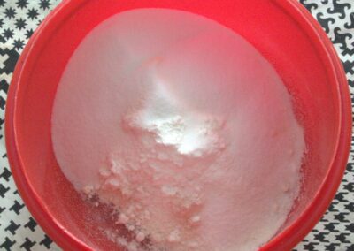 1. korak : U posudi za miješanje dodajte 2 čaše brašna, 2 žličice gustina i čašu soli. Dobro promiješajte.