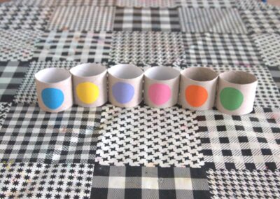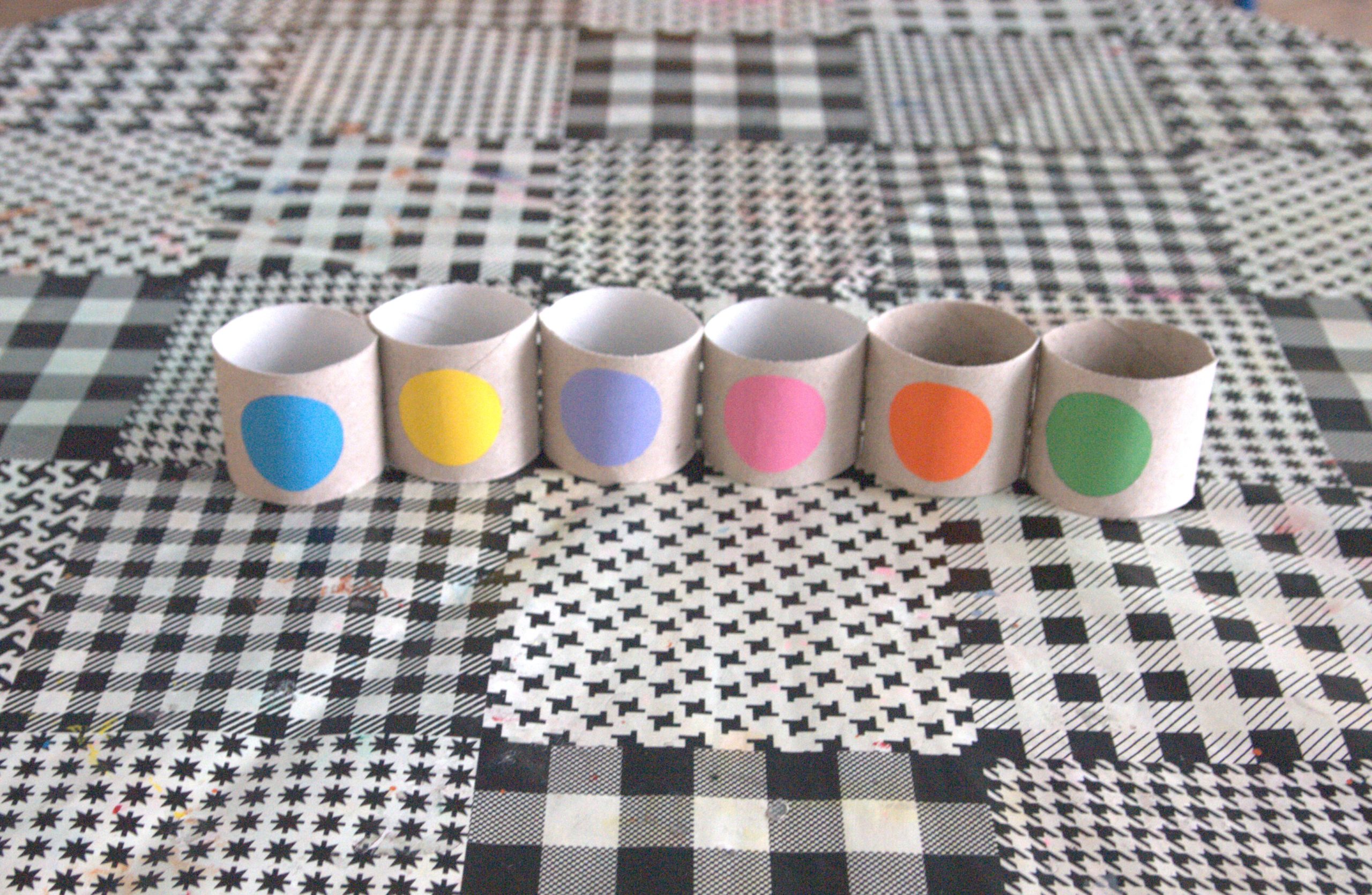 3. korak : Od kolaž papira izrežemo krugove. Boje izabrati po želji. Treba nam 6 različitih boja. Zalijepimo na izrezane rolice.