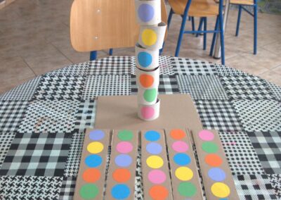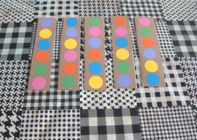 4. korak : Na trakama od kartona zalijepimo krugove bojama koje smo izabrali. Na svaku traku lijepimo različit redoslijed boja.